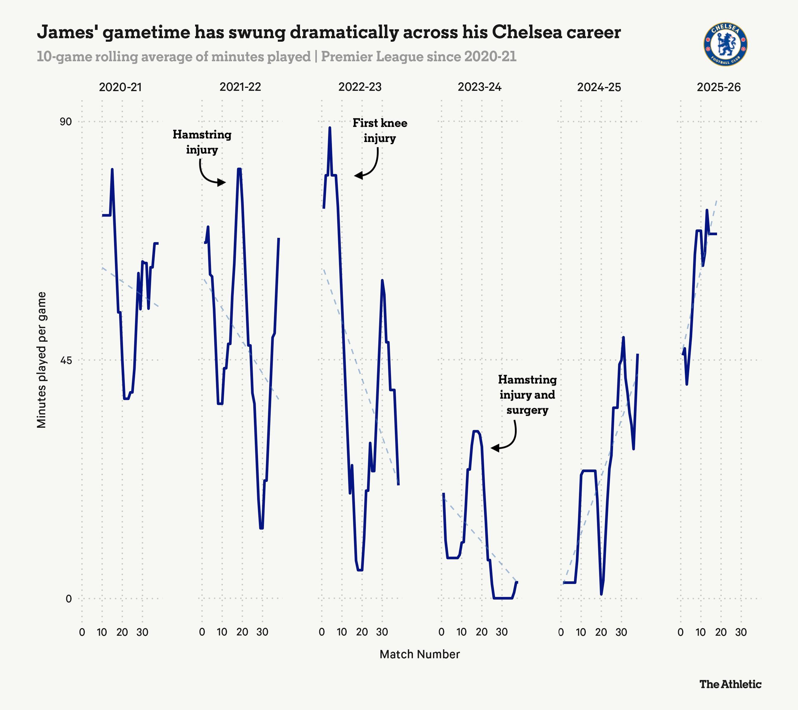 切尔西在节日期间比赛中的两项数据,凸显了詹姆斯出勤率的提升。