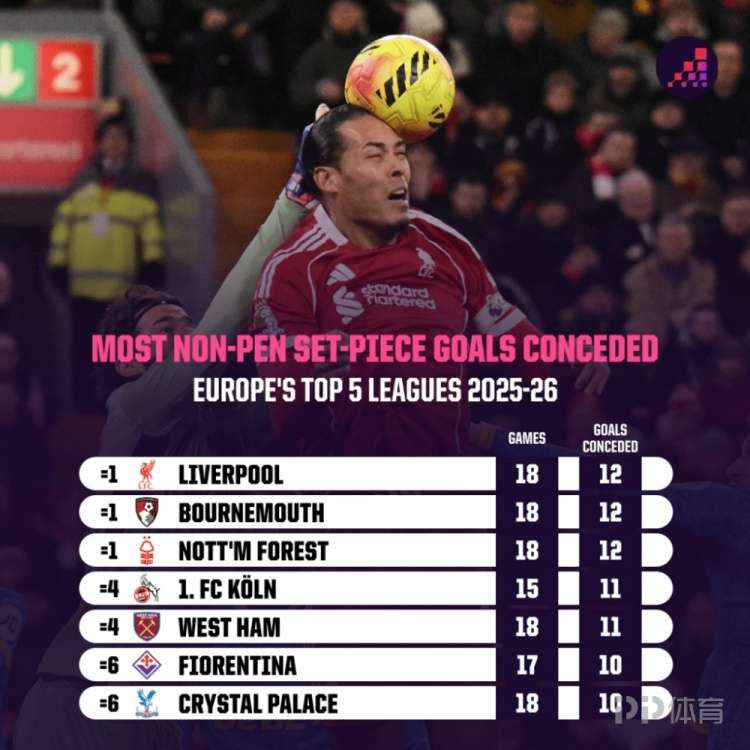 利物浦本赛季定位球丢球数12球 五大联赛所有球队并列最多