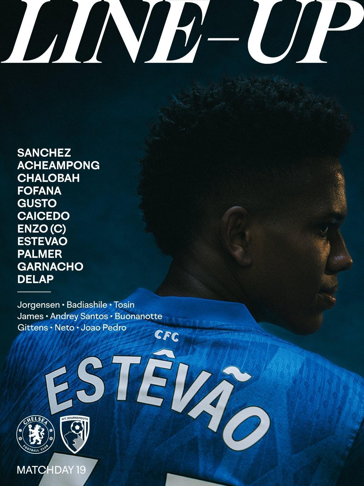 北京时间12月31日凌晨3点30分,英超联赛第19轮展开一场焦点战役,切尔西对阵伯恩茅斯。赛前,双方公布首发阵容。