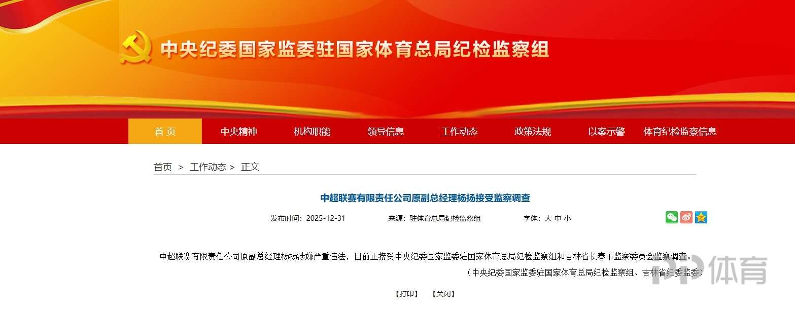 据国家体育总局消息,中超联赛有限责任公司原副总经理杨扬涉嫌严重违法,目前正接受中央纪委国家监委驻国家体育总局纪检监察组和吉林省长春市监察委员会监察调查。