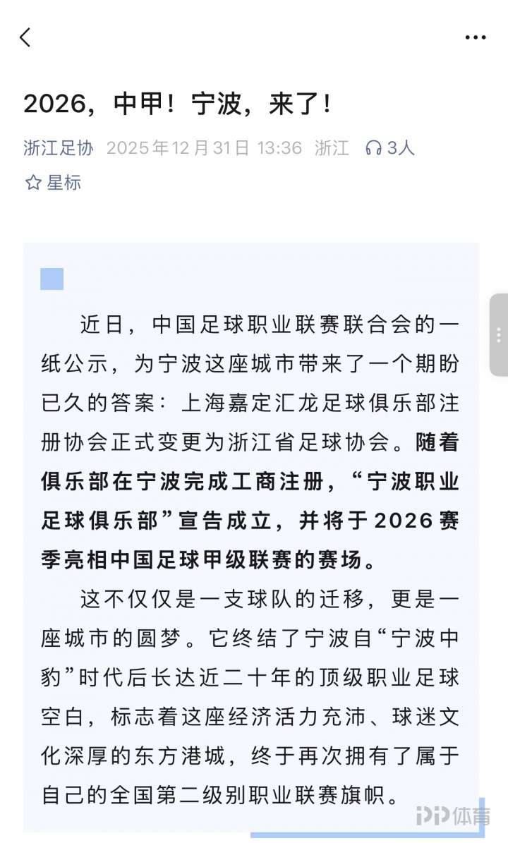 浙江足协官宣:宁波职业足球俱乐部成立 2026赛季亮相中甲