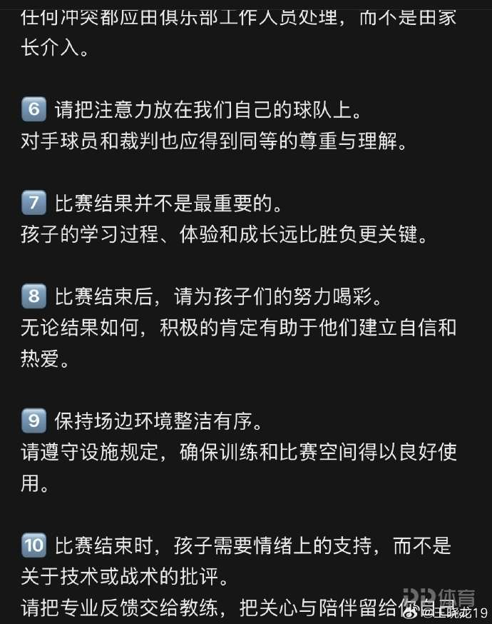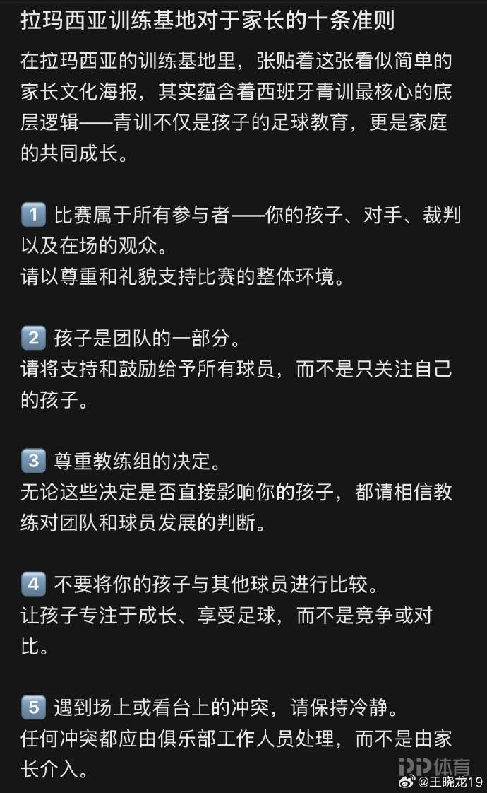 孙继海转发王晓龙微博,继续回应近期热议话题——青训应该怎么做?孙继海表示,“拉玛西亚青训10准则,家长、教练、社会,共同营造一个重过程而不是结果的非功利环境,这才是青训原本的模样。”