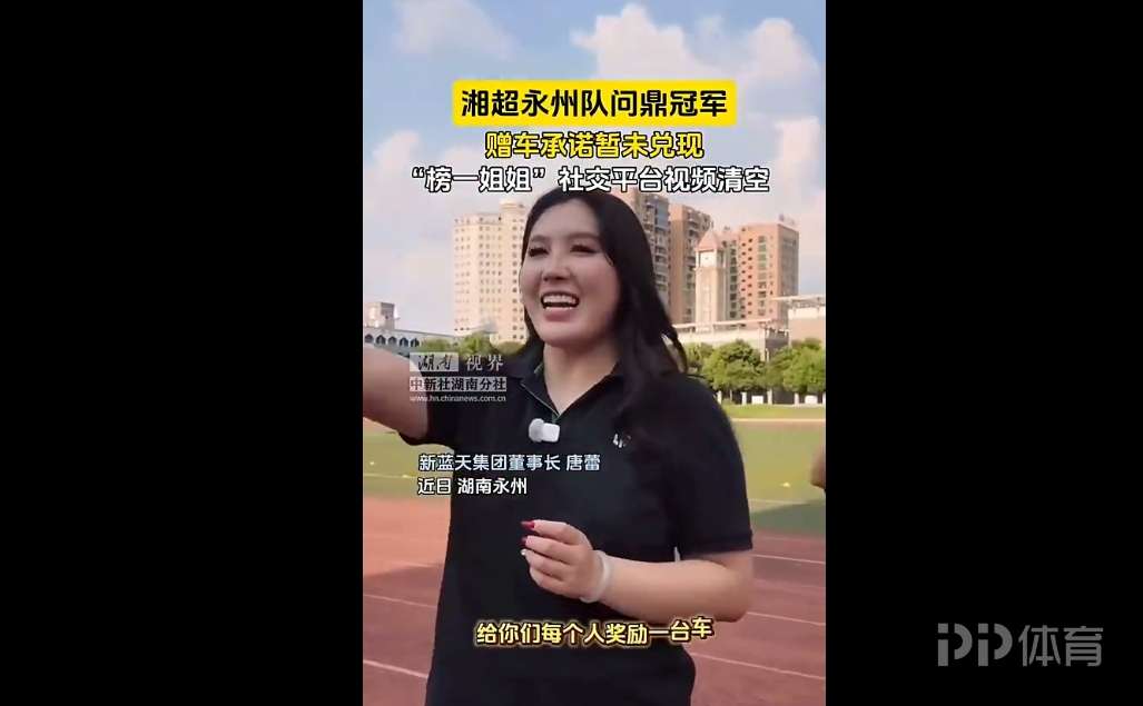 早在2025年8月,永州新兰天集团董事长唐蕾在激励永州队员时就曾表示:“这次‘湘超’,你们拿到冠军,给你们每人奖励一台车!”此后,唐蕾在其个人账号也先后两次表示会履行送车承诺。有网民曾质疑唐蕾“送的是电瓶车”,对此,唐蕾还公开回应称:“说实话,我格局有那么小吗?”然而,距离12月27日晚永州夺得“湘超”冠军已经过去四天时间,唐蕾仍未公开现身履行送车承诺,并于30日清空了其个人账号内的所有视频。