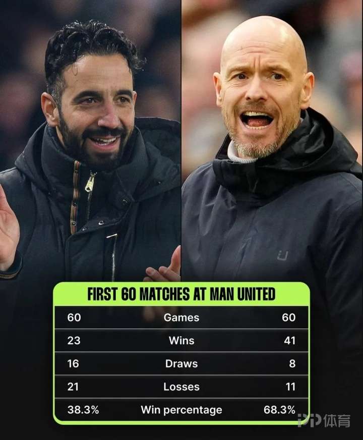 阿莫林曼联前60场23胜胜率38.3% 滕哈赫胜率68.3%